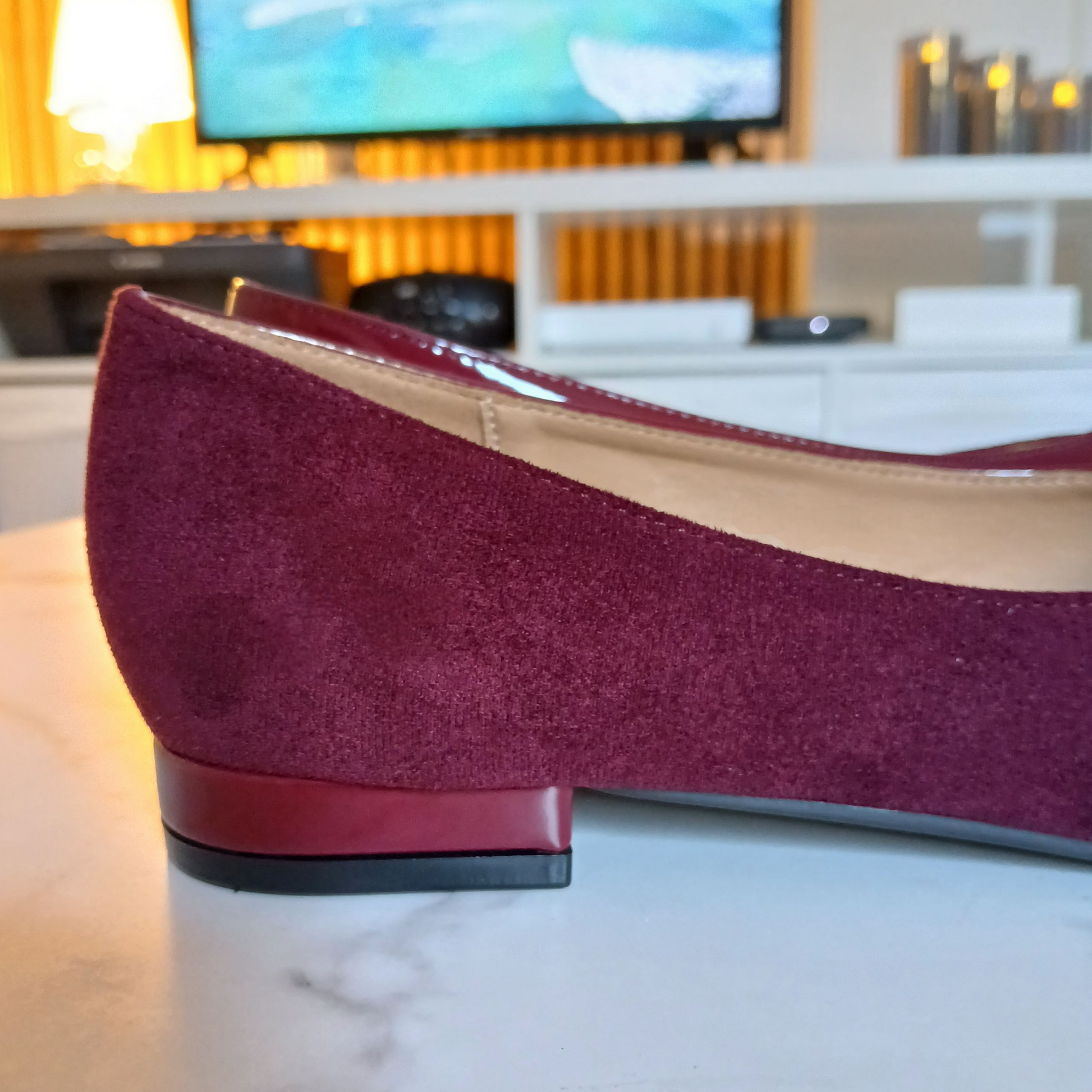 Ces ballerines sophistiquées allient la douceur de la suédine synthétique résistante au raffinement du cuir synthétique brillant. Leur pointe effilée et leur coloris bordeaux profond apportent une touche chic à toutes vos tenues. Que cette chaussure t'accompagne sur les bons chemins au nom de Jésus-Christ.